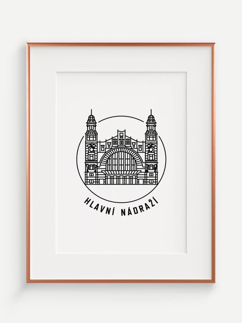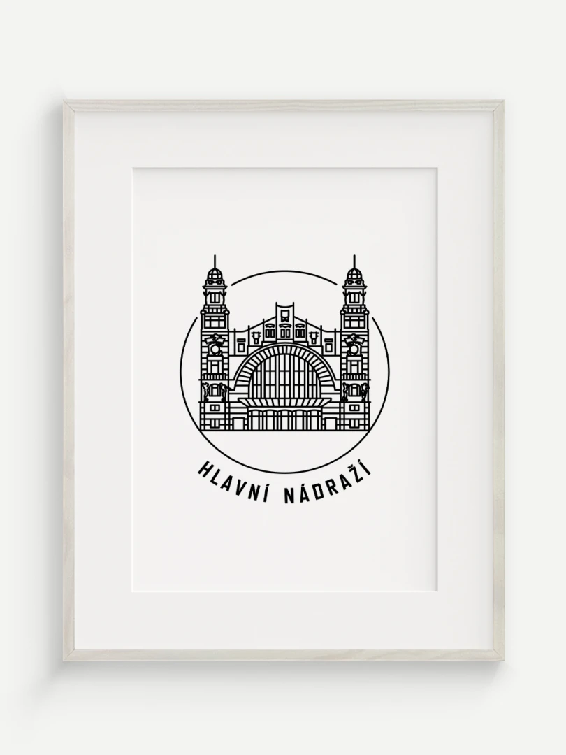 Tento print představuje stylizované, minimalistické zobrazení Hlavního nádraží v Praze, budovy, která spojuje historické a moderní architektonické prvky. Vytvořen jemnou černou linkovou kresbou na kvalitním papíře, tato ilustrace zachycuje čisté linie a elegantní detaily stanice v nadčasovém stylu.